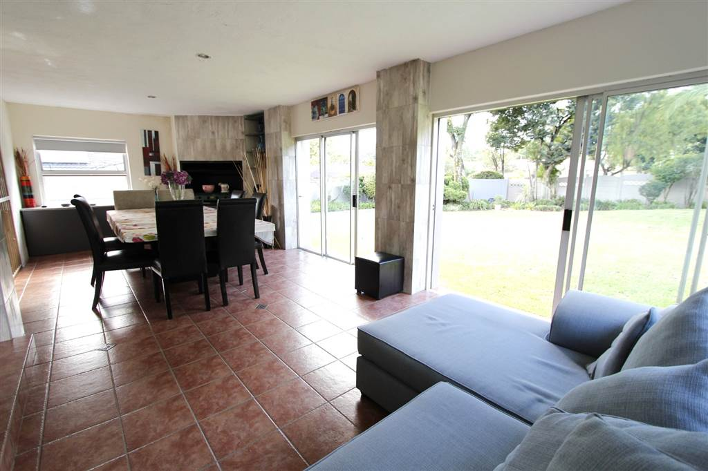 Living areas flow out to a large, enclosed entertainer’s patio with gas braai, built-in cupboards, and sliding doors opening to a beautiful garden and sparkling pool — ideal for relaxing and entertaining.