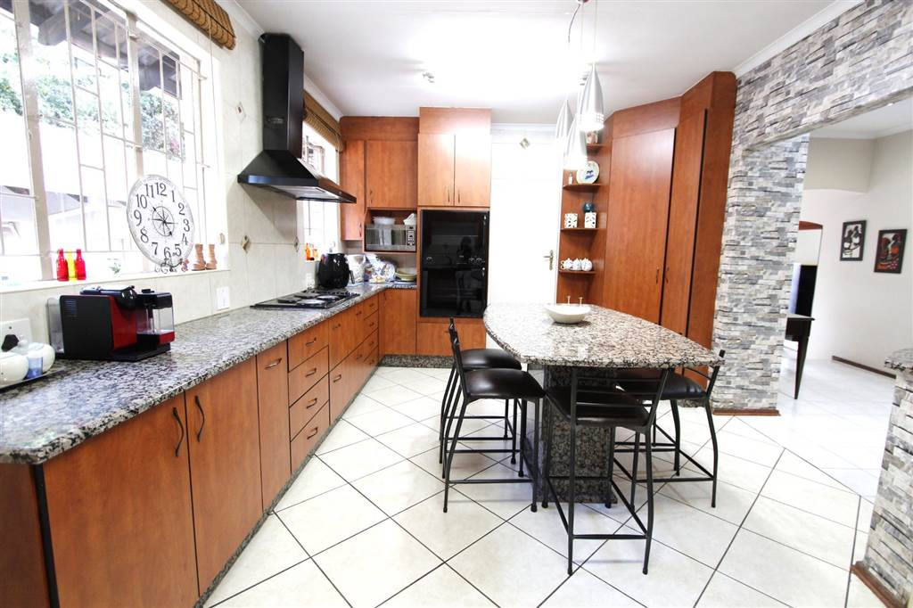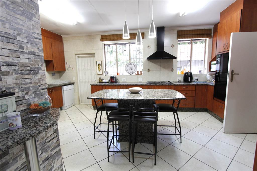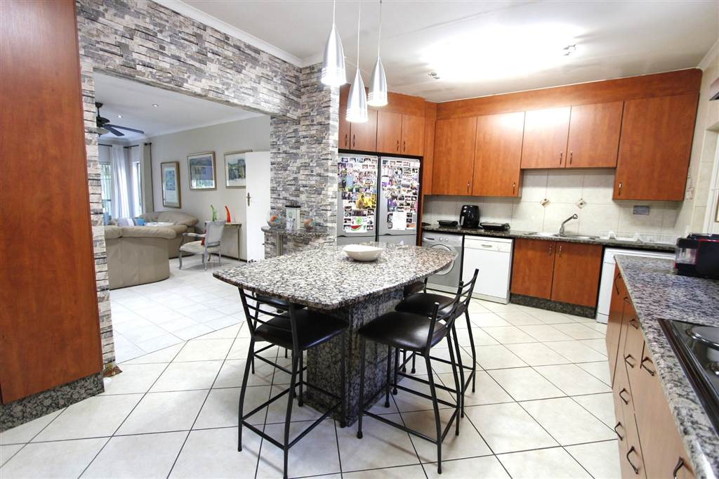 The open-plan granite kitchen offers ample cupboard space, a breakfast nook, space for a double fridge/freezer, and three appliances.