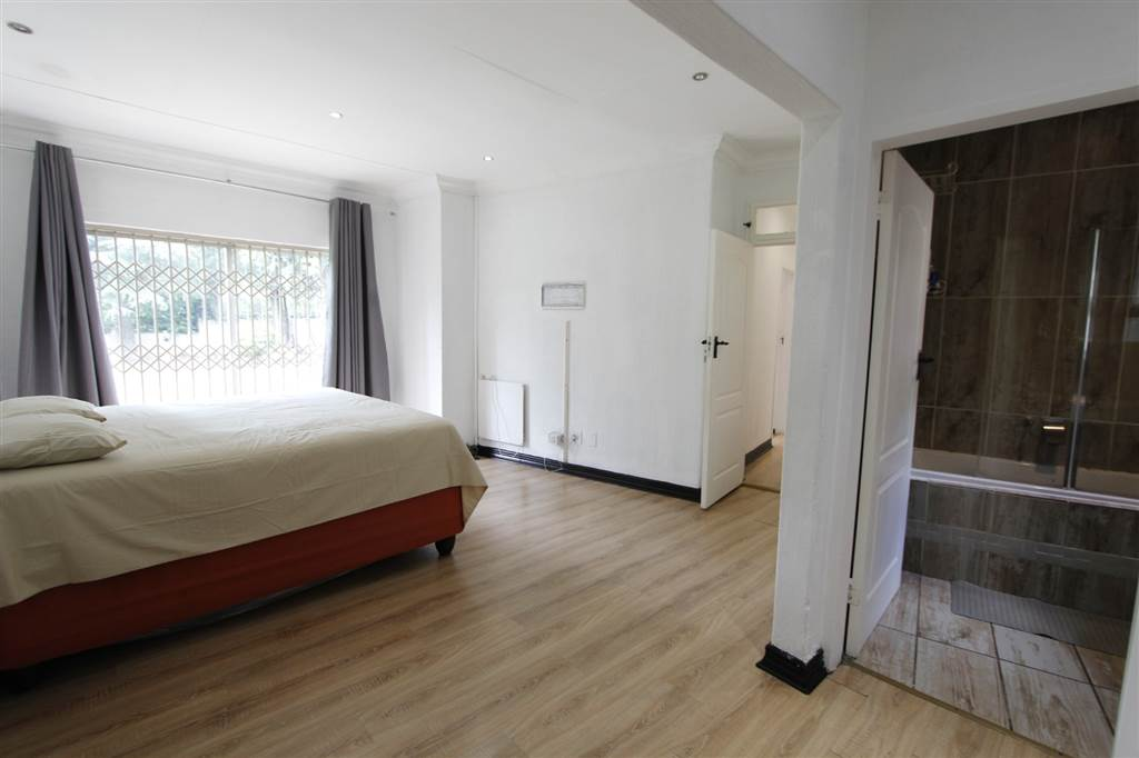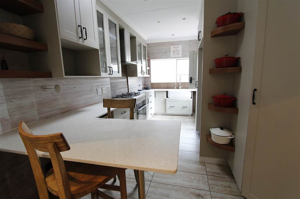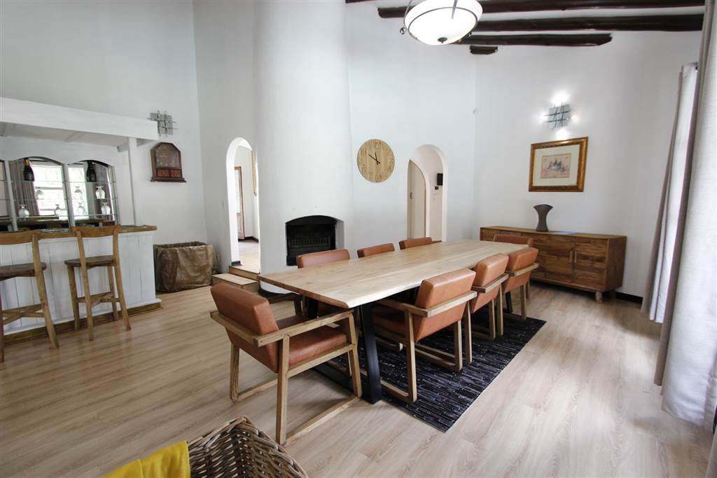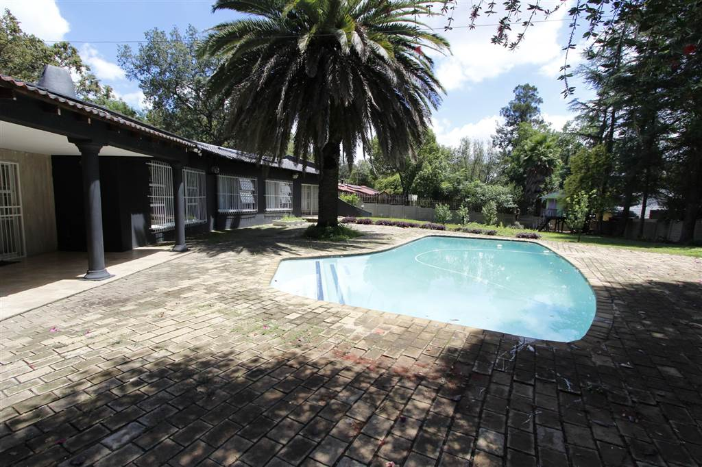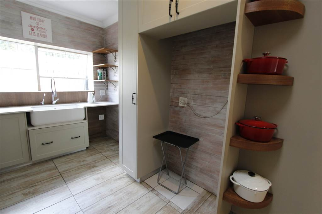 - Covered patio with built-in braai overlooking sparkling pool and large treed garden