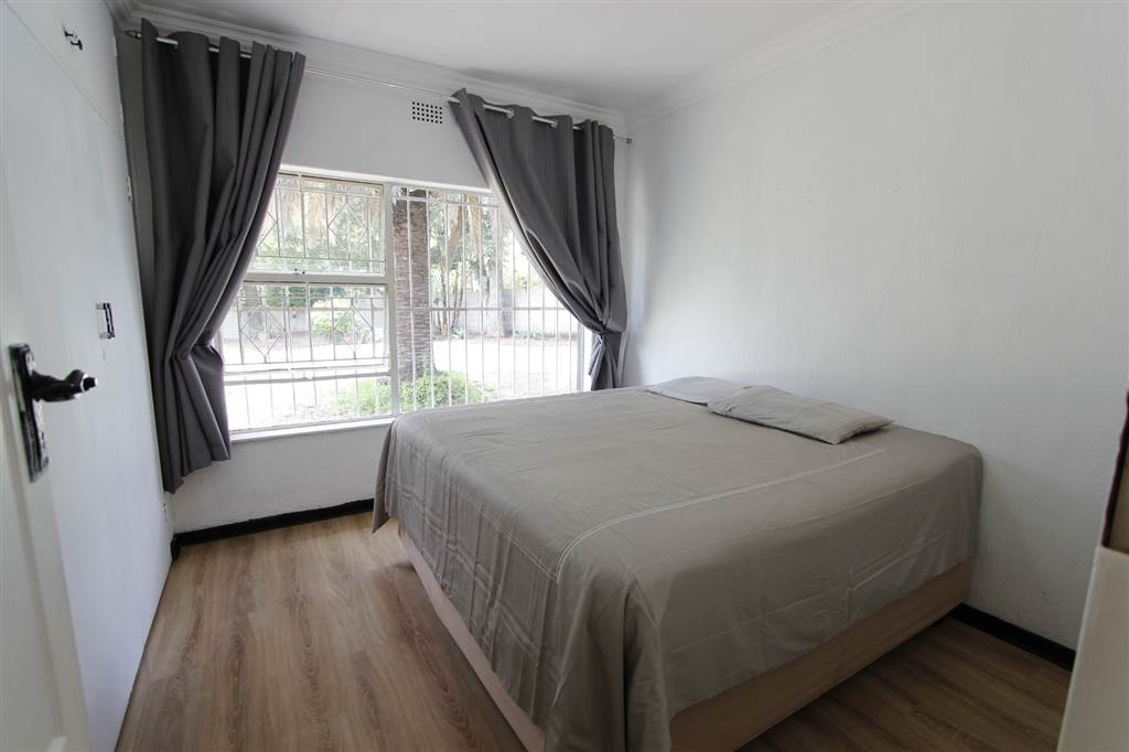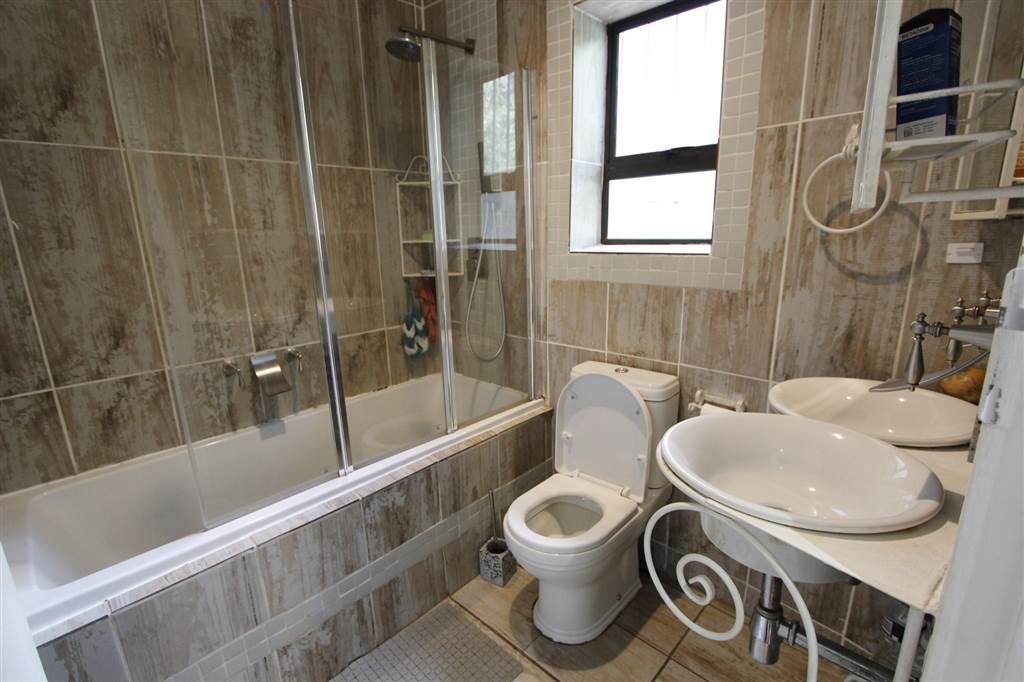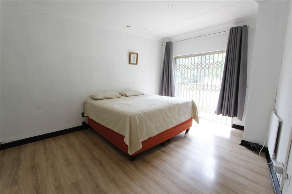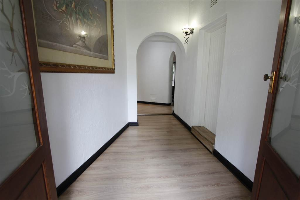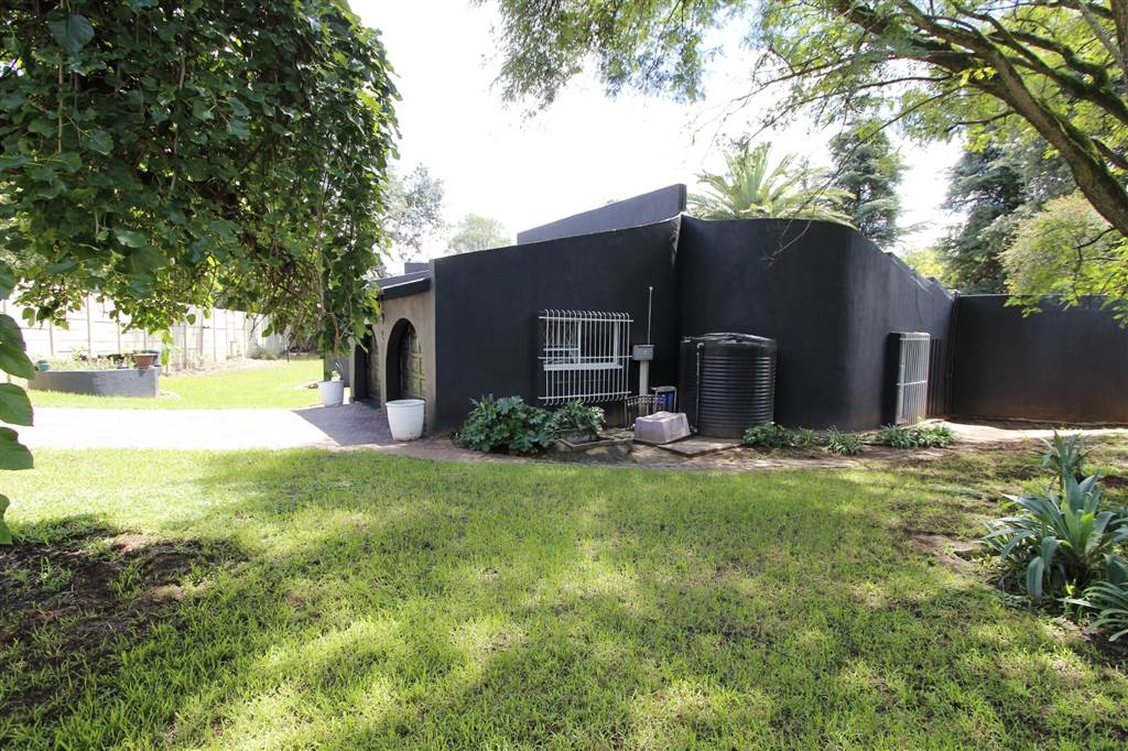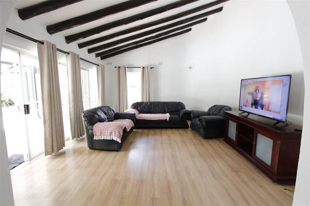 - Covered patio with built-in braai overlooking sparkling pool and large treed garden